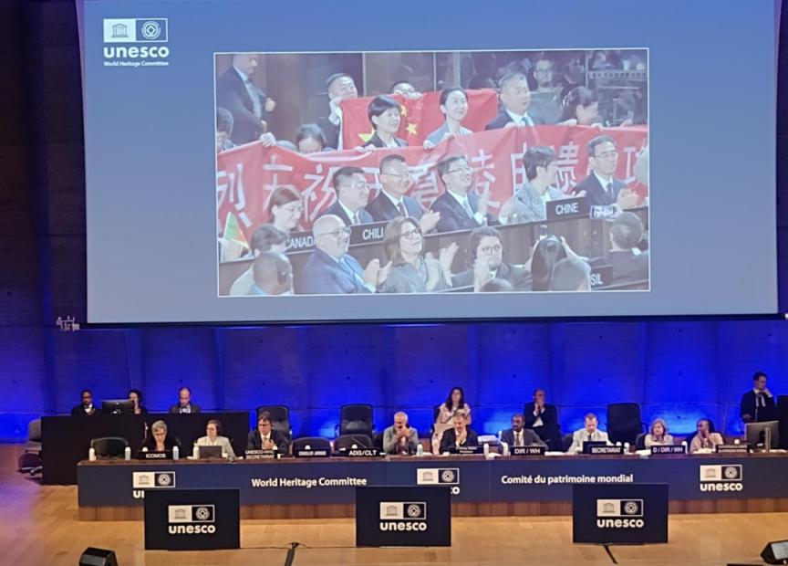 大会主席落锤通过决议,宣布“西夏陵”被列入《世界遗产名录》。