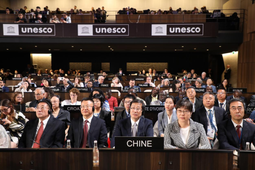 全场在向中国代表团表示祝贺。
